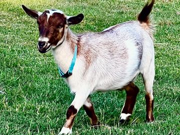 Cashew is a polled, bottle raised Nigerian Dwarf and is as sweet as they come. She is always in your pocket and looking for love and attention.