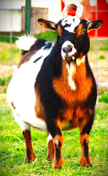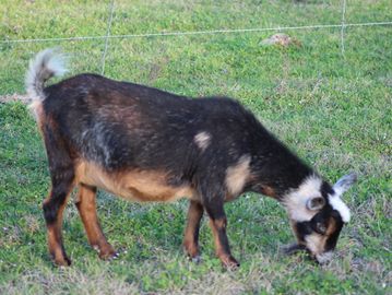 Sundae has been with us for about 3 years, She is a beautiful tri color, brown eyed, Nigerian Dwarf. She is a great mom and doesn't miss dinner time! She is sweet and will let you lover her on HER terms.